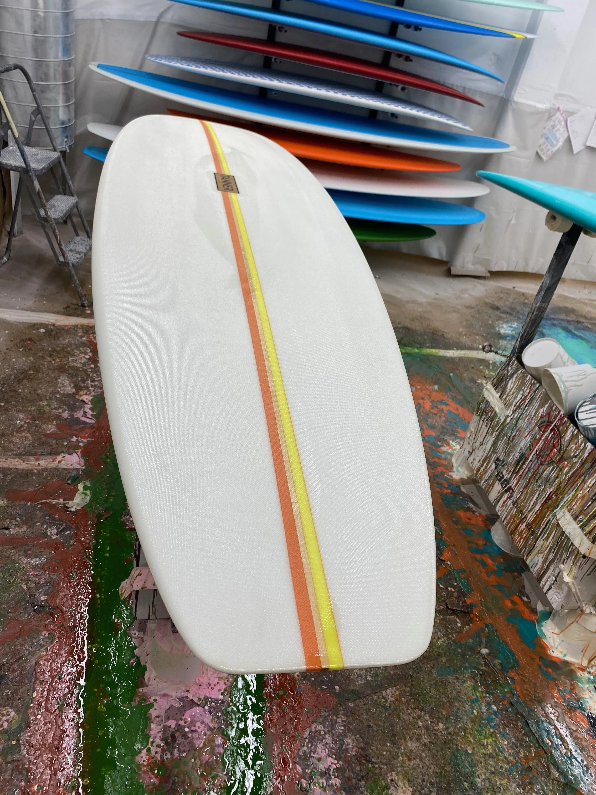If effortless speed and down the line trim is what your after then this is the board. Inspired by Greg Liddle. This board works well in point waves and clean, lined up beach breaks. Smooth plane shape, pinched rails, hull entry and “s” deck are what give this board its unique characteristics. It is very different than conventional style boards so there is a bit of a learning curve. It encourages a more front foot style turning. The feeling you get when drawing out a big bottom turn and locking into trim is like no other. Works best with a volan flex fin. Comes standard with 3/16” cedar stringer, single box, and volan. Starts at $1140.