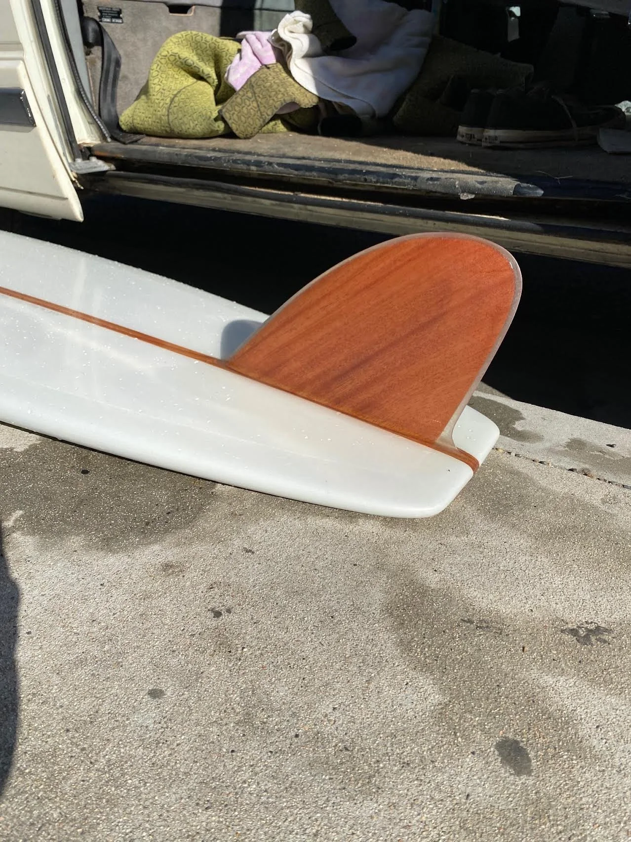 Inspired by Phil Edwards and his board he called “baby”. This model trims and turns with ease. The outline is sleek and over all rocker is flat. The 60/40 rails provide control and flow through turns. Works best in waves 2-4 feet. Comes standard with glass on wood baby fin and 3/4” cedar stringer. Starting price $1580.